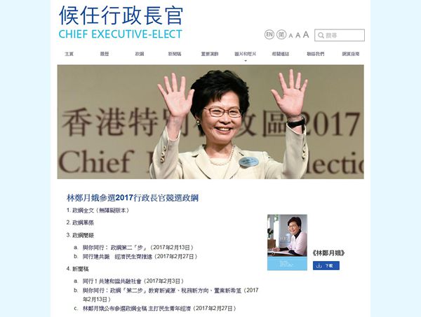 候任行政長官林鄭月娥網站已经啟用