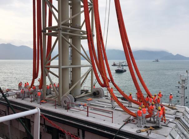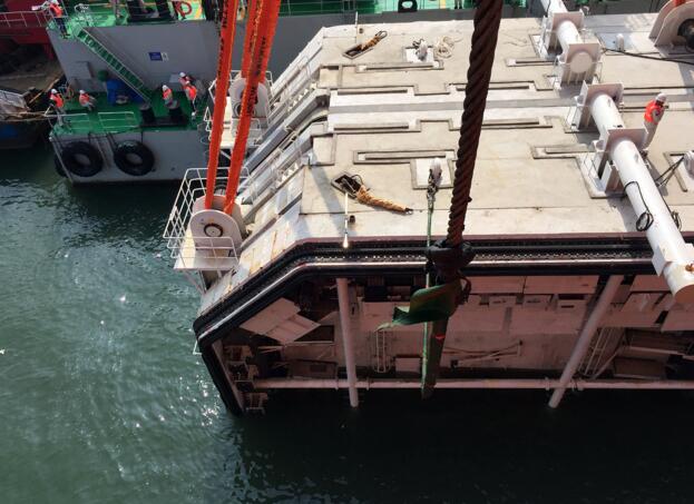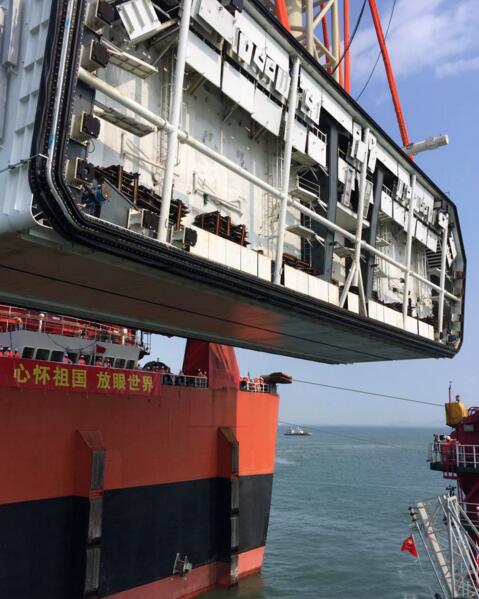 港珠澳大橋海底隧道的最終接頭吊裝現場。