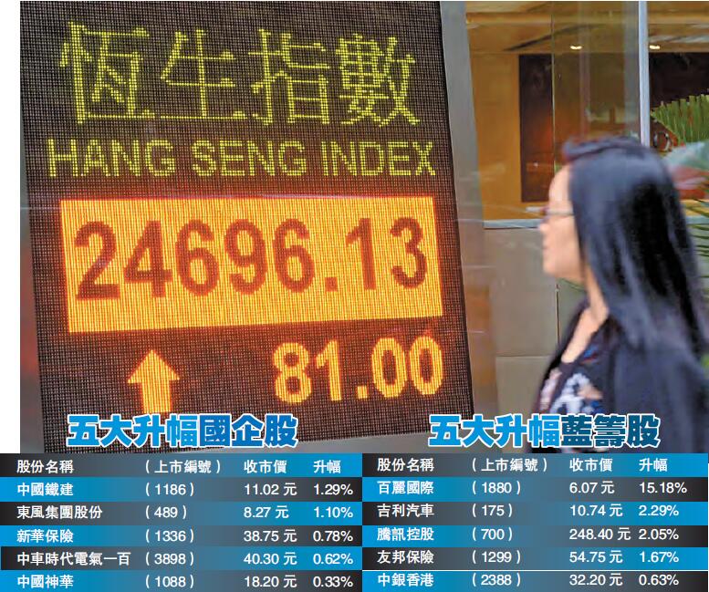港股昨高開158點報24773點見近21個月高,惟午后港股走勢轉弱,一度倒跌至24577點。恒指全日成交696.6億元,收報24696點,升幅0.33%。不過A股走弱拖累中資股表現,國企指數收報10173點跌0.45%。手機相關股續獲追捧,舜宇光學科技(2382)高見67.8元,收報67元,單日升4.69%。瑞聲(2018)早盤破頂見116.5元,惟全日倒跌0.7%,收報113.4元。