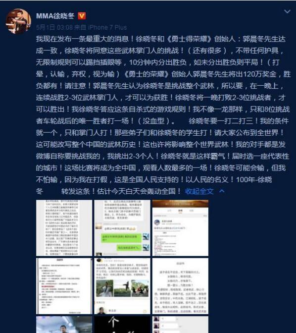 5月1日凌晨,徐曉冬更新微博,聲稱已和《勇士的榮耀》創始人郭晨冬達成一致,接受2-3位武林掌門人的挑戰!比武依然不限規則,不帶任何護具,允許踢擋插眼。