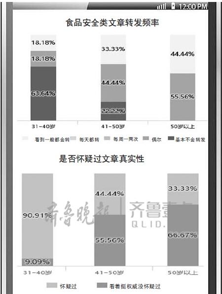 濟南心理衛生協會副會長張洪濤認為,中老年人普遍關注食品安全問題,而轉發這些內容的人則是出于一種求關注、求交流的心態,想用新奇有用的信息來與他人產生交流。調查問卷中,50歲以上的人中88%都表示關注食品安全,41歲至50歲的人中也占了39%,年輕人則在14%左右。