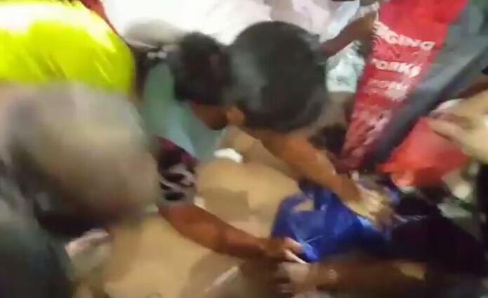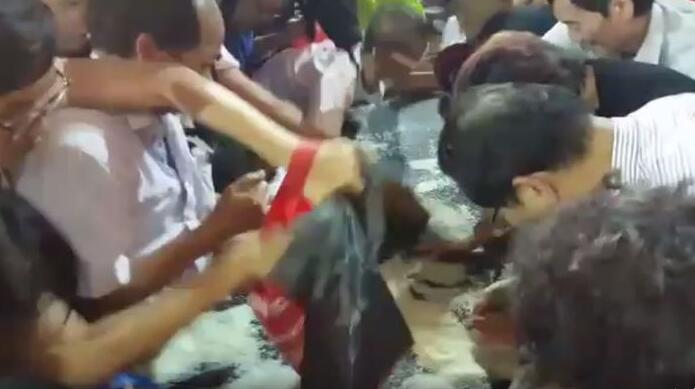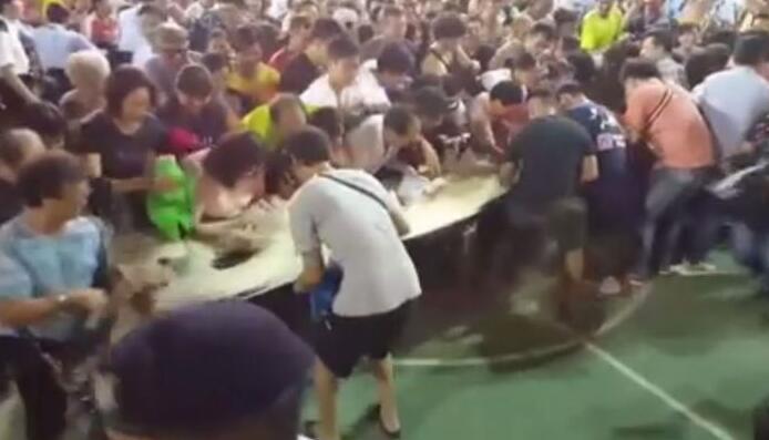 警方架起鐵欄,並在場戒備,但目睹狂搶畫面,也無法紓緩現場高漲氣氛。不足一分鐘,桌上的平安米已被旋速搶空。