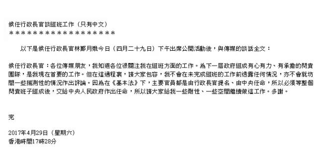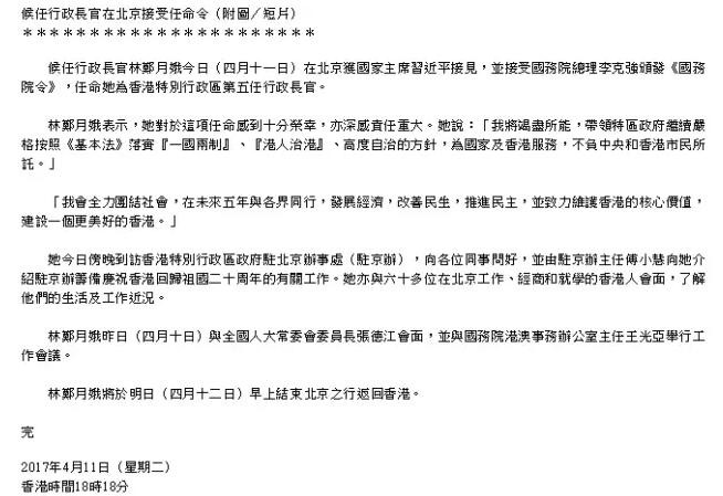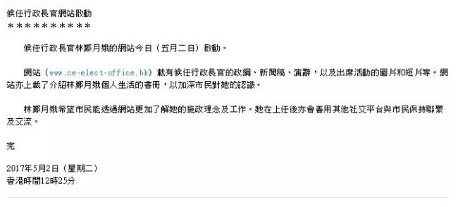 候任行政長官林鄭月娥的網站(www.ce-elect-office.hk)昨日正式啟動。網站載有候任行政長官的政綱、新聞稿、演辭,以及出席活動的圖片和短片等。林鄭月娥表示,希望市民透過網站更加了解她的施政理念及工作,她上任后亦會善用其他社交平臺與市民保持聯系及交流。