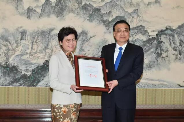 候任行政長官林鄭月娥(左)4月11日在北京接受國務院總理李克強(右)頒發《國務院令》,任命她為香港特別行政區第五任行政長官。