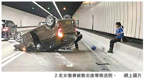事發昨晨10時28分,一輛掛「P」字牌的私家車,由姓劉女子(23歲)駕駛,載同一名姓郭女乘客(40歲),沿荃灣大欖隧道中線駛往九龍,其間私家車疑與另一輛中型貨車發生碰撞,當時失控先撞向快線路邊石壆,再反彈回快線路中翻轉,四輪朝天滑行近10米始停下,車上司機位及車頭乘客位的氣袋彈出,兩人當場受傷被困。