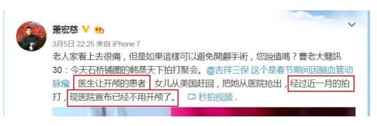 3月5日,“神醫”更是堂而皇之在新浪微博發文,聲稱一個腦動脈瘤患者,被其拍打一個月后治好了。