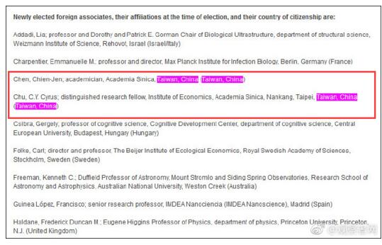 美國國家科學院此前標注“中國台灣”