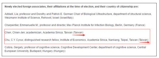 據介紹,目前美國家科學院外籍院士中,台灣人士還包括“中研院前院長”李遠哲、“中研院物理研究所特聘研究員”吳茂昆及台灣大學醫學院教授陳定信,三人“國籍”標示都是台灣。