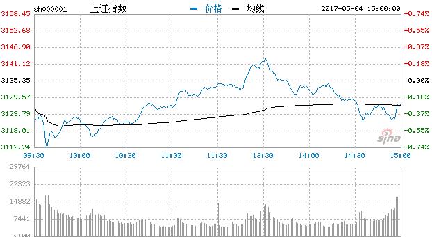 新浪財經訊 5月4日消息,滬深兩市早盤低開,受雄安大漲影響,兩市指數一度小幅反彈,創指盤中漲幅一度逼近1%,下午雄安跳水,股指同步沖高回落。截止收盤,滬指報3127.37,跌0.25%,創指報1838.10,跌0.13%。