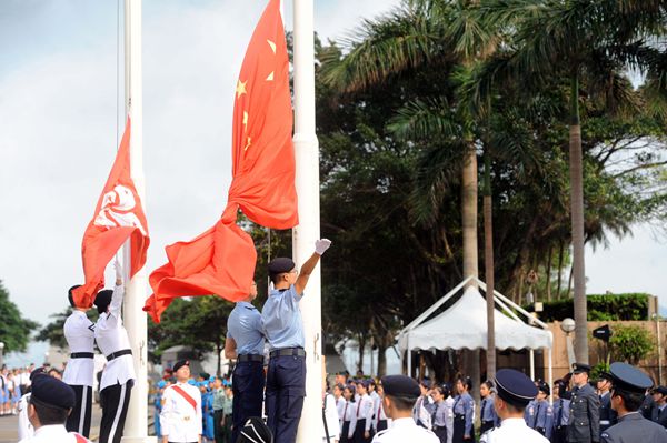 昨早7時許,由香港青少年制服團體組成的儀仗隊、升旗隊、護旗隊、銀樂隊以及旗手已經在廣場上整裝待發。7時45分左右,在雄壯激昂的《歌唱祖國》的旋律中,來自香港14個制服團體的青少年代表邁著矯健的步伐入場。升旗儀式於8時正準時開始,在身穿藍裙白襪的香港兒童合唱團領唱下,全場高唱國歌,升旗手莊嚴地升起了中華人民共和國國旗和香港特別行政區區旗。