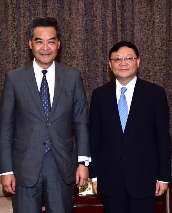 特首梁振英昨午赴深与深圳市委书记王伟中(右)会面,讨论港深合作及配合粤港澳大湾区城市群共同发展。政府新闻处