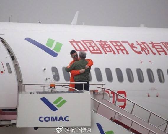 C919首飛返航,飛機總設計師吳光輝與機長蔡俊緊緊相擁!
