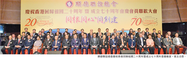 【香港商報網訊】記者洪紫瑩報道︰順德聯誼總會慶祝香港回歸祖國20周年暨成立70周年會慶晚宴,日前於灣仔會展圓滿舉行。行政長官梁振英,中聯辦副主任林武,順德區區長彭聰恩,佛山市委常委、統戰部部長黃喜忠及佛山市政協主席熊志翔等擔任主禮嘉賓。晚宴筵開近140席,場面盛大。