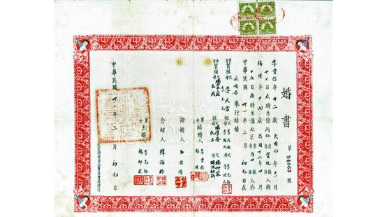 說到新人結婚時需簽署的婚書,民國年間的結婚證書一般有新郎新娘生辰、籍貫、家庭成員及各自姓名等內容,並列出結婚日期、地點、證婚人、介紹人、男女雙方主婚人等詳細信息。北洋政府在1914年頒布的《關於人事憑證貼用印花條例》規定:婚書要貼印花壹圓,如不貼用印花或不蓋章畫押者,在法庭上無合法憑證之力。1934底國民政府公布的《印花稅法》將每張婚姻證書須貼的印花稅改到四角。金融界、教育界、洋行職員和知識分子新青年比較青睞這種官方出具的新式婚書。