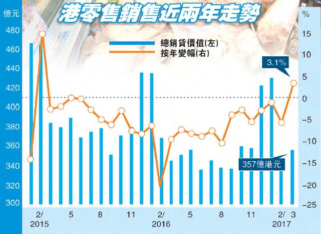 【香港商報網訊】記者伍敏報道:政府統計處昨日公布的數據顯示,今年3月香港零售業總銷貨價值的臨時估計為357億港元,按年升3.1%,銷貨數量則按年升2.7%,終止連跌24個月的頹勢;總計今年首季,銷貨值則下跌1.3%,銷貨量跌1.7%。業界預計,受五一黃金周帶動,4月零售業總銷貨價值仍有輕微增長,全年則維持下跌2%至3%預測不變。