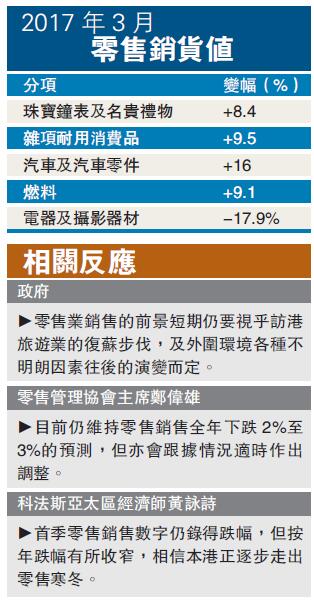 數據顯示,今年3月零售業總銷貨價值的臨時估計為357億港元,按年升3.1%,銷貨數量則按年升2.7%,其中,占銷貨值最高的珠寶首飾、鐘表及名貴禮物升8.4%;汽車及汽車零件升一成六;電器及攝影器材跌近一成八。