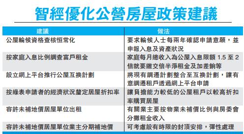 司徒偉傑續指,經仔細審視公屋政策及措施成效,智經建議推行「公屋互換計劃」,讓公屋租戶透過網上平台申請與其他租戶對調單位。政府可將現有房委會的調遷計劃與之整合,交由房屋署按申請原因進行配對,並優先照顧較有迫切需要的申請者,相信計劃一方面可增加有調遷需要租戶的選擇及成功調遷機會,另一方面可將原本預留作調遷的單位編配予公屋輪候人士,以縮短輪候時間,以全港有76萬個家庭居於出租公屋計算,每年只要有百分之一租戶獲成功配對,受惠家庭已達7600個。
