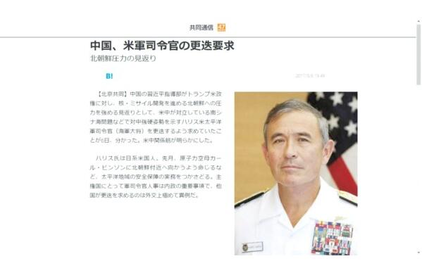 日本共同社6日晚報道稱,為了要求美國對中國向朝鮮加強施壓作出回報,中國政府要求美國更換太平洋司令哈里斯,理由是他在南海問題上對中國采取強硬姿態。報道稱,這條消息是5月6日“一名熟悉中美關系的消息人士”透露的。報道說,對于主權國家來說,軍隊司令的人選調整屬于內政重大事項,他國要求更換是極端異常的。這名消息人士稱,中方是通過駐美大使向美方表達這一要求的,“但可能已經被美方駁回”。消息人士還說,中方同時要求特朗普政府不要把中國列為“匯率操縱國”,鑒于北京在華盛頓應對朝鮮問題上的作用,美方沒有給中國貼上“匯率操縱國”標簽。