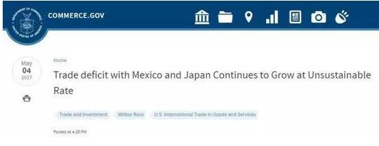 5月4日,美國商務部發布了一份題為《對墨西哥和日本的貿易逆差已經達到難以忍受的水平》的聲明,直接點名日本和墨西哥兩國。聲明中,商務部長羅斯稱“美國已經無法忍受如此快速擴大的貿易逆差”。
