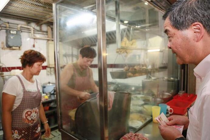 梁振英其後又指,昨天自己在大埔墟逛街市,之後在沙頭角街市喝下午茶,還買了半隻白切雞和半隻白切鴨。
