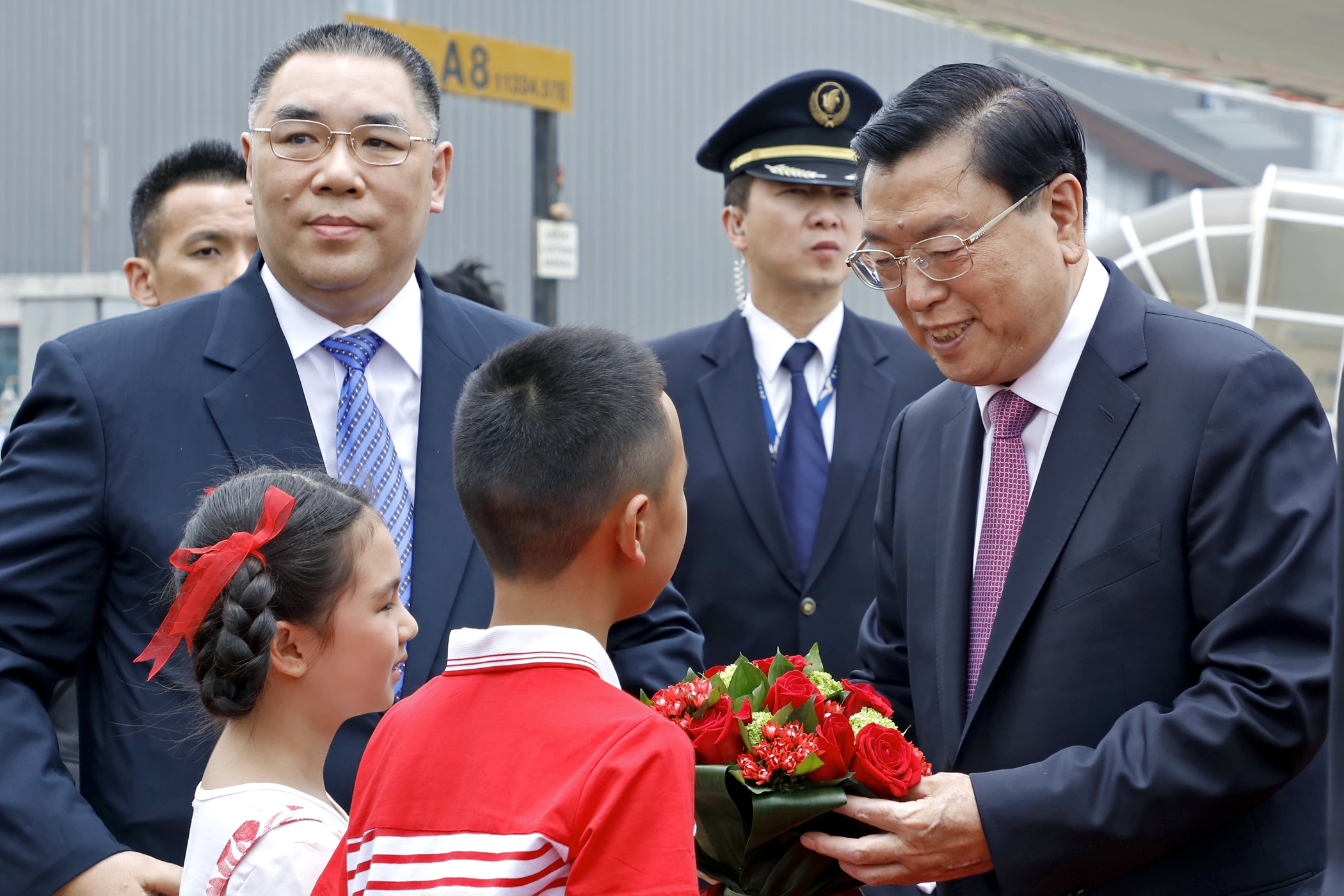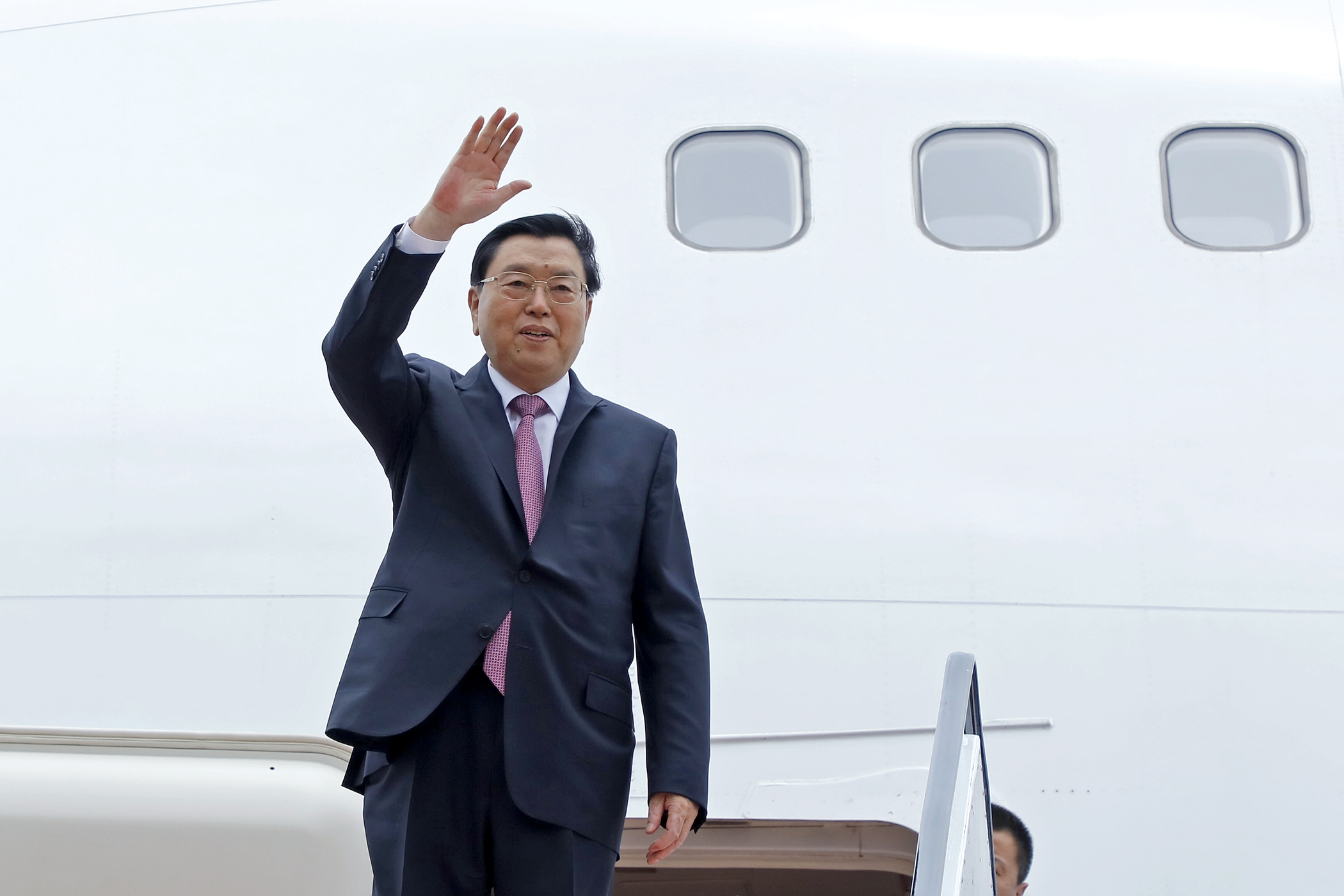 當天中午12時許,飛機徐徐降落在澳門國際機場。張德江走下舷梯,澳門警察銀樂隊奏起歡迎樂曲,240名手持國旗、區旗和絹花的學童熱烈歡迎。在澳門特首崔世安陪同下,張德江同迎接人員親切握手,隨后來到媒體采訪區。張德江微笑着向中外記者問好,并請他們轉達習近平主席、中央政府和全國各族人民對澳門同胞的親切慰問和良好祝願。