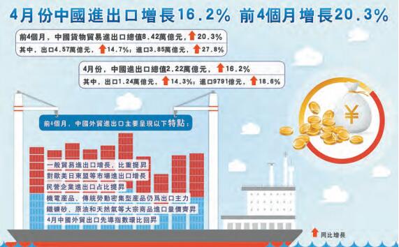 據海關統計,今年前4個月,中國貨物貿易進出口總值8.42萬億元人民幣,比去年同期增長20.3%。其中,出口4.57萬億元,增長14.7%;進口3.85萬億元,增長27.8%;貿易順差7150億元,收窄26.2%。海關總署稱,前4個月,中國外貿進出口主要呈現以下特點:一是一般貿易進出口增長,比重提升;二是對歐美日東盟等市場進出口增長;三是民營企業進出口占比提升;四是機電產品、傳統勞動密集型產品仍為出口主力;五是鐵礦砂、原油和天然氣等大宗商品進口量價齊升。另外,4月份,中國外貿出口先導指數為40.7,較上月回升0.5。