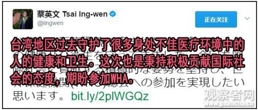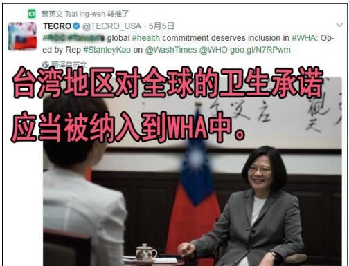 5月8日,是本月22日在日內瓦舉行的WHA的截止報名日期,面對台灣地區尚未收到邀請函,蔡英文“很著急”,連續轉發兩條推特。