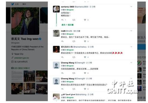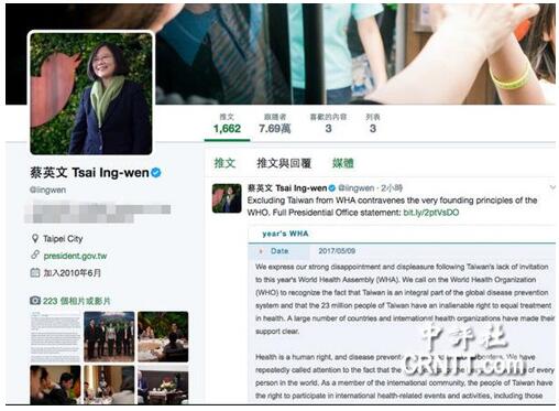 海外網5月9日電 據中評社台北報道,蔡英文9日傍晚針對台灣沒有獲得世界衛生大會(WHA)邀請函,第12度在推特上發文。蔡英文推文表示,“世界衛生大會不讓台灣參與,違反世界衛生組織(WHO)的基本權利”;并附上“總統府”聲明的英文版本。但不管蔡英文推文是英文或是日文,底下都有許多簡體字的響應,多數大陸網民都批評蔡政府,還有網友嘲諷蔡英文學特朗普推文,但卻沒人理。