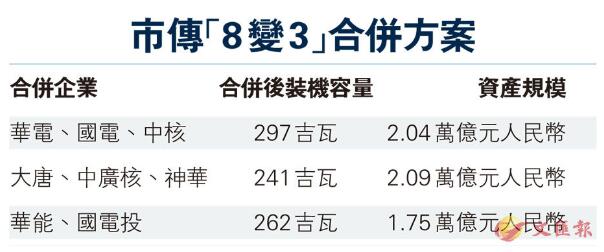 多家國企重組方案近日再次進入公眾視野。據彭博引述知情人士消息,內地正考慮將目前主要火電企業和核電企業,通過合并重組為3家。分別是:兩家最大的火電企業華電和國電,將與第二大的核電企業中核合并,合并后的公司裝機容量將達297吉瓦,資產規模2.04萬億元。五家最大火電企業之一的大唐或與中廣核以及神華合并,合并后的公司裝機容量達241吉瓦,資產規模2.09萬億元。另一火電企業華能以及國電投也將合并,后者持有國家核電技術公司,合并后的公司裝機容量達262吉瓦,資產規模1.75萬億元。