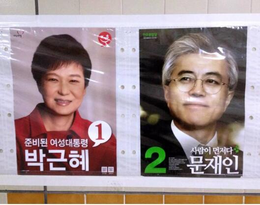 2012年韓國第18屆總統選舉期間,總統候選人朴槿惠與文在寅的海報。新華社記者冮冶攝