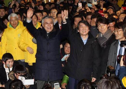 2012年韓國第18屆總統選舉期間,安哲秀與候選人文在寅共同參加一場選舉造勢活動。新華社發(朴真熙攝)