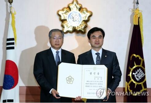 5月10日,在果川中選委辦公樓,中選委委員長金龍德(左)向共同民主黨秘書長安圭伯轉交當選證書后合影留念。