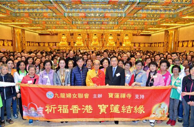 【香港商報網訊】由九龍婦女聯會主辦、寶蓮禪寺支持的「祈福香港寶蓮結緣」活動於日前舉辦,食物及衛生局局長高永文、中聯辦九龍工作部部長何靖、香港佛教聯合會會長智慧大和尚、九龍婦女聯會榮譽會長黃曾自香應邀擔任主禮嘉賓,與來自觀塘、九龍城、深水桋、油尖旺及黃大仙五區共700多位坊眾一齊參與其中。