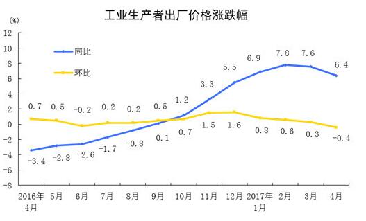 2017年4月份工業生產者出廠價格同比上漲6.4%