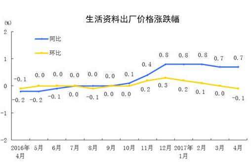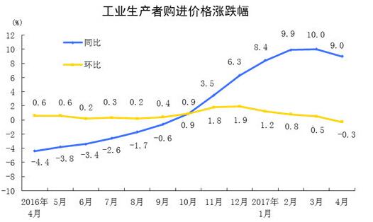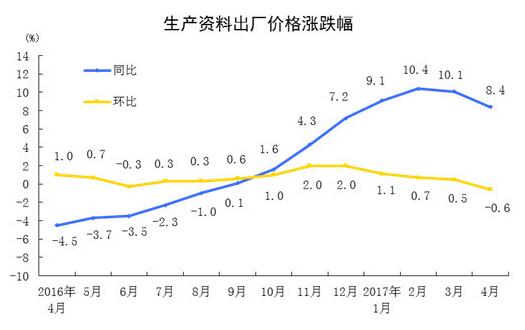 2017年4月份,全國工業生產者出廠價格同比上漲6.4%,環比下降0.4%。工業生產者購進價格同比上漲9.0%,環比下降0.3%。1-4月份平均,工業生產者出廠價格同比上漲7.2%,工業生產者購進價格同比上漲9.3%。