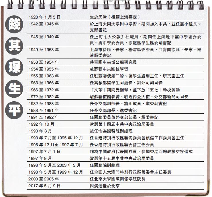 錢其琛曾在中共中央、國務院長期主管外交、港澳事務和對台工作。尤其是在香港,錢其琛的名字一點都不陌生,因他曾處理香港主權轉移事宜,并公布著名的「錢七條」。