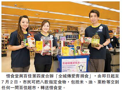 由即日起至7月2日,市民可把於任何地方購買、任何品牌的八款指定食物,包括米、油、粟粉、米粉、罐頭、燕麥、密封包裝的冬菇及雲耳,交到任何一間百佳、Fu-sion、TASTE、International、Gourmet、GREAT或SU-PA-DE-PA超市內的藍色食物收集箱。只要是未過期及未開封,百佳便會將收集到的捐贈食物運送至惜食堂,協助惜食堂制作熱飯餐免費給有需要人士享用,讓他們得到溫飽。