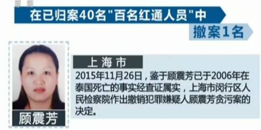 上海市顧震芳案,2015年11月26日,鑒于顧震芳已于2006年在泰國死亡的事實經查證屬實,上海市閔行區人民檢察院作出撤銷犯罪嫌疑人顧震芳貪污案的決定。