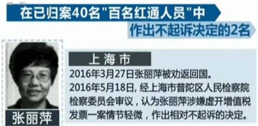 上海市張麗萍案,2016年3月27日張麗萍被勸返回國。2016年5月18日,經上海市普陀區人民檢察院檢察委員會審議,認為張麗萍涉嫌虛開增值稅發票一案情節輕微,作出相對不起訴的決定。