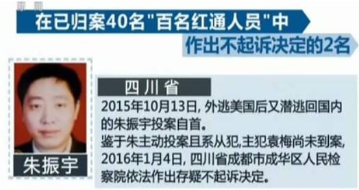 四川省朱振宇案,2015年10月13日,外逃美國后又潛逃回國內的朱振宇投案自首。鑒于朱主動投案且系從犯,主犯袁梅尚未到案,2016年1月4日,四川省成都市成華區人民檢察院依法作出存疑不起訴決定。