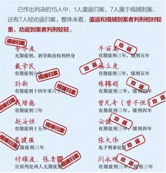 根據40名“紅通”人員歸案后的情況,基本上接受勸返投案自首的人員都判處了緩刑,強制遣返的則判實刑。