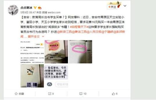 5月9日,有網友在微博發布多張圖片,稱“江西吉安市青原區天立實驗小學、富灘小學、天玉小學學生家長收到短信,要求花費16元購買一本由青原區體育教育局長主編的《悅讀故鄉》書籍。”并質疑官員出書讓學生購買的行為,引發媒體關注。
