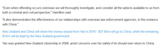 報道援引新西蘭警方的聲明稱,2016年8月,警方對閆永明的4285萬新西蘭元(約合2.02億元人民幣)資產進行充公,其中2785萬新西蘭元(約合1.3億元人民幣)還給中國,剩下的1500萬新西蘭元(約合7080萬元人民幣)將上繳新西蘭國庫。