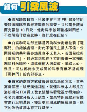 ●白宮和司法部宣稱是因為科米對希拉莉「電郵門」的錯誤處理,對此不僅民主黨人不信,公開質疑的共和黨參議員也不乏其人。若因希拉莉「電郵門」,何必等到現在?特朗普甫一掌權即解除科米職務,還能彌補大選裂痕、爭取人心。況且,司法部尚未完成關於科米有無不當處理「郵件門」的內部審查。