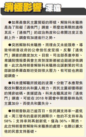 ●突然解除科米職務,而理由又未能服眾,導致特朗普政府的公眾信任度受損,反擊「通俄門」調查的難度加大。目前,司法部長塞申斯、眾議院情報委員會主席努涅斯都被迫回避涉俄調查,此次為特朗普解除科米職務出謀劃策的司法部副部長羅森斯坦受到很大壓力,有可能也將回避調查。