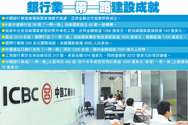 ●中國銀行跟進「一帶一路」大型項目460個,到今年年底授信預計將超1000億美元。首發「一帶一路」主題債券76億美元。