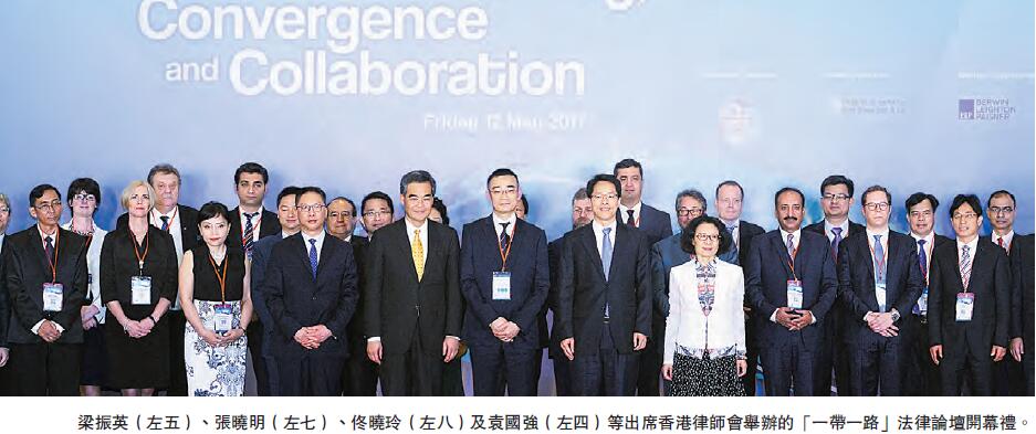 香港律師會昨早舉行「一帶一路」論壇,邀請行政長官梁振英、中聯辦主任張曉明、律政司司長袁國強等出席。梁振英在會上致辭時表示,「一帶一路」倡議為本港帶來新機遇。他指,本港在「一國兩制」下,能與內地建立更緊密經貿關係,亦能為沿線國家提供法律服務,是一個理想夥伴。他又指,去年中國在「一帶一路」沿線國家的直接投資達到145億美元,而沿「一帶一路」的貿易、投資和基礎建設,亦會帶來不少法律方面的需求,包括合約談判、合約管理和糾紛調解等等,香港不會袖手旁觀,讓這些商機流走。