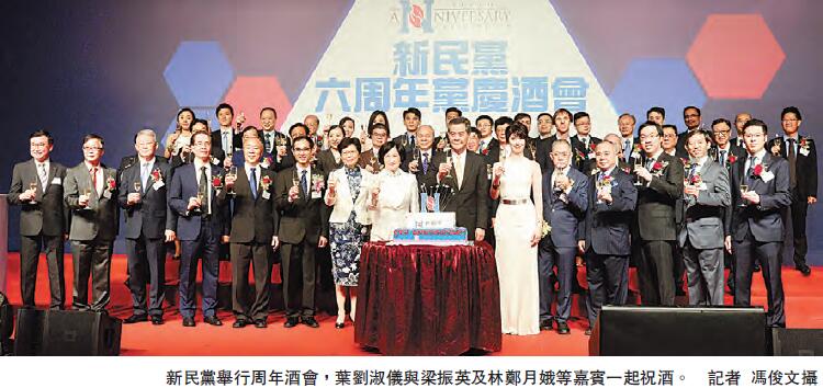 新民黨成立6周年黨慶酒會,昨日在灣仔會議展覽中心舉行,多位嘉賓出席,包括行政長官梁振英、候任行政長官林鄭月娥;出席的其他官員包括財政司司長陳茂波、政制及內地事務局局長譚志源、商務及經濟發展局局長蘇錦樑、教育局局長吳克儉等;行政會議召集人林煥光等行政會議成員均有到場;多位立法會議員出席,包括立法會主席梁君彥、民建聯立法會議員蔣麗蕓、經民聯主席盧偉國等;此外,全國人大常委范徐麗泰、基本法委員會副主任梁愛詩等政界人士亦有到場。