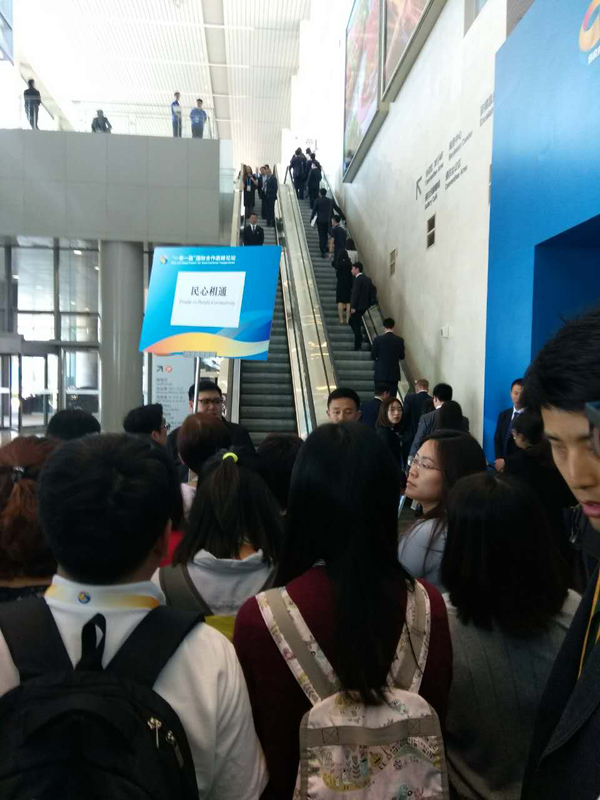 下午將舉行六場平行會議,議題分別是“五通”(政策溝通、設施聯通、貿易暢通、資金融通、民心相通)和智庫交流。原定會議一點半開始,目前可以進入相關分論壇的記者排隊等待分發場地副證,隨後在工作人員帶領下才能進入分會場。