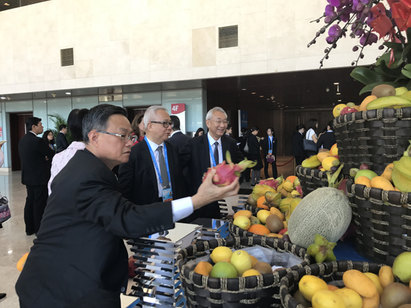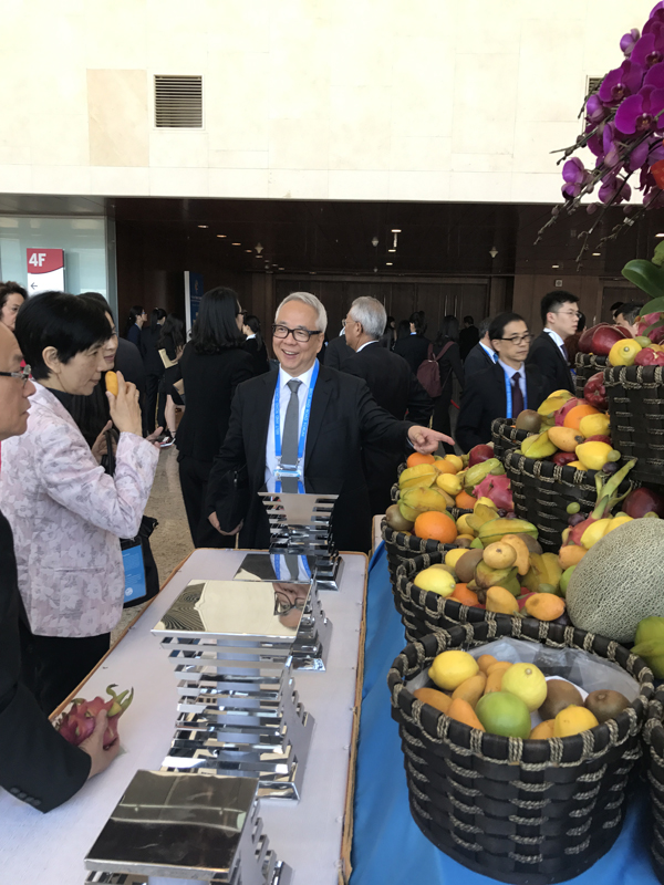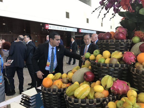 擺放在“一帶一路”國際合作高峰論壇開幕式現場外的水果造型頗為討喜。國家會議中心工作人員介紹說,其名為“碩果累累”,以熱帶水果為主,全部可以直接食用。從早上到現在,已經有過半水果被各國嘉賓取用品嘗,味道獲得了一致好評。
